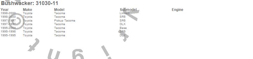 Below is an abbreviated list of applications for the Extend-A-Fender Flares.Tacoma, Toyota, 2004, 2003, 2002, 2001, 2000, 1999, 1998, 1997, 1996, 1995