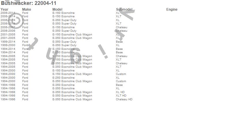 Below is an abbreviated list of applications for the Extend-A-Fender Flares.E-150 Econoline, E-150 Econoline Club Wagon, E-250 Econoline, E-350 Econoline, E-350 Econoline Club Wagon, E-350 Super Duty, Ford, 2014, 2013, 2012, 2011, 2010, 2009, 2008, 2007, 2006, 2005, 2004, 2003, 2002