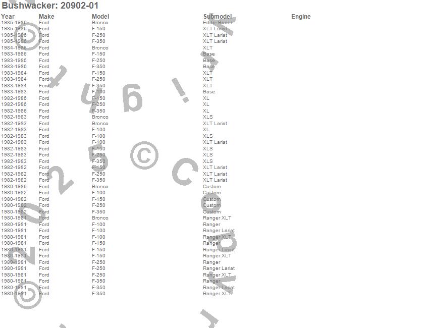 Below is an abbreviated list of applications for the Extend-A-Fender Flares.Bronco, F-100, F-150, F-250, F-350, Ford, 1986, 1985, 1984, 1983, 1982, 1981, 1980