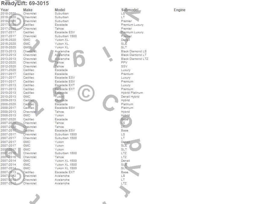 Below is an abbreviated list of applications for the SST Lift Kit.Avalanche, Escalade, Escalade ESV, Escalade EXT, Suburban, Suburban 1500, Tahoe, Yukon, Yukon XL, Yukon XL 1500, Cadillac, Chevrolet, GMC, 2020, 2019, 2018, 2017, 2016, 2015, 2014