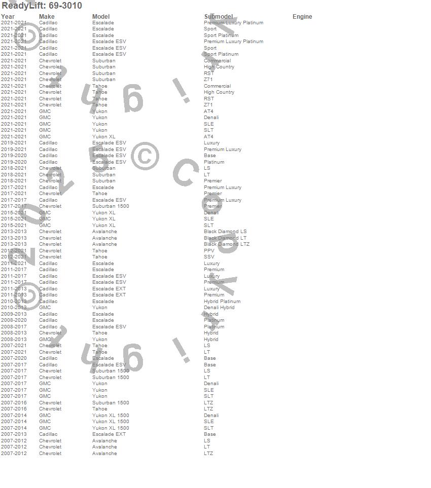 Below is an abbreviated list of applications for the SST Lift Kit.Avalanche, Escalade, Escalade ESV, Escalade EXT, Suburban, Suburban 1500, Tahoe, Yukon, Yukon XL, Yukon XL 1500, Cadillac, Chevrolet, GMC, 2020, 2019, 2018, 2017, 2016, 2015, 2014