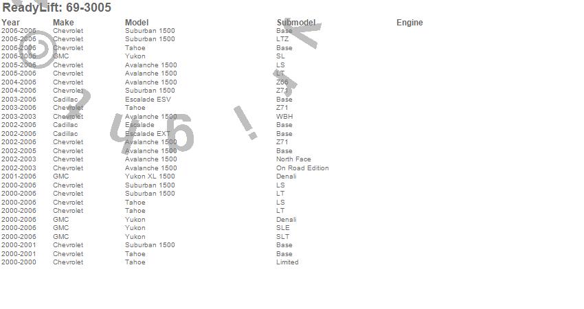 Below is an abbreviated list of applications for the SST Lift Kit.Avalanche 1500, Escalade, Escalade ESV, Escalade EXT, Suburban 1500, Tahoe, Yukon, Yukon XL 1500, Cadillac, Chevrolet, GMC, 2006, 2005, 2004, 2003, 2002, 2001, 2000