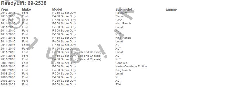 Below is an abbreviated list of applications for the SST Lift Kit.F-250 Super Duty, F-350 Super Duty, F-450 Super Duty, Ford, 2016, 2015, 2014, 2013, 2012, 2011, 2010, 2009, 2008