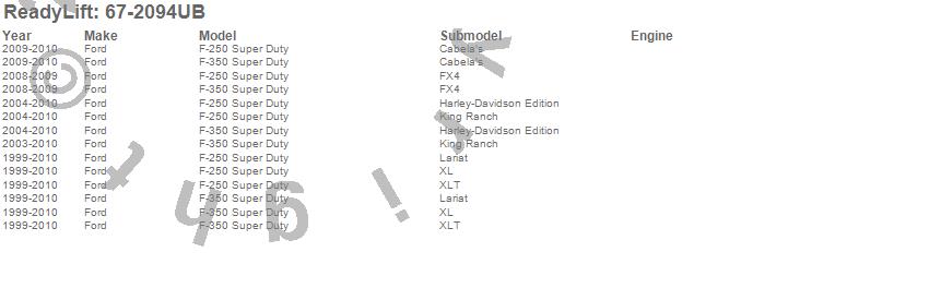 Below is an abbreviated list of applications for the U-Bolt Kit.F-250 Super Duty, F-350 Super Duty, Ford, 2010, 2009, 2008, 2007, 2006, 2005, 2004, 2003, 2002, 2001, 2000, 1999