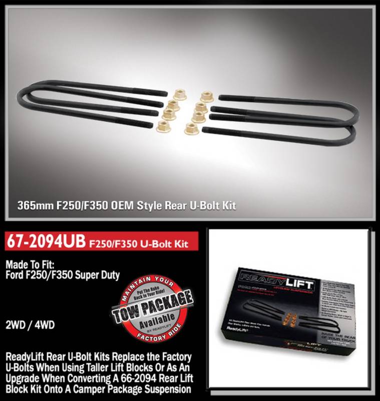 Brand: ReadyLiftPart Number: 67-2094UBAxle U-Bolt Kit Type: 4 in. Lift - Rear - Incl. 4 Rnd M14 365mm Long U-Bolts/8 Crush Nuts - For Use w/PN[66-2094] If Your Vehicle Has Camper PackageUPC: 893131001813