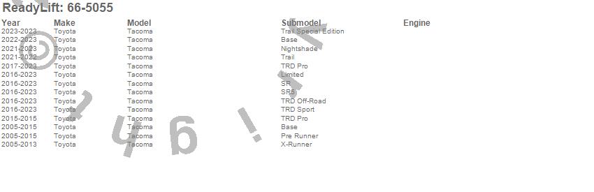 Below is an abbreviated list of applications for the Front Leveling Kit.Tacoma, Toyota, 2023, 2022, 2021, 2020, 2019, 2018, 2017, 2016, 2015, 2014, 2013, 2012, 2011, 2010, 2009, 2008, 2007, 2006