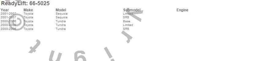 Below is an abbreviated list of applications for the Front Leveling Kit.Sequoia, Tundra, Toyota, 2007, 2006, 2005, 2004, 2003, 2002, 2001, 2000