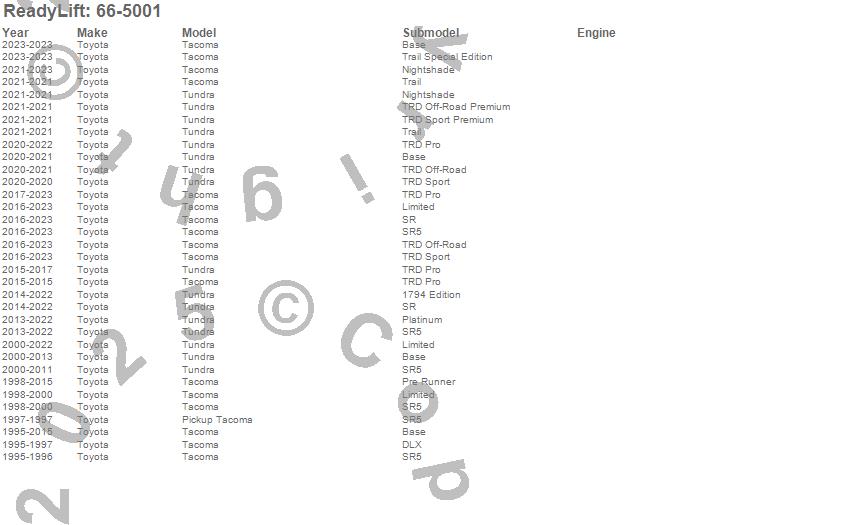Below is an abbreviated list of applications for the Rear Block Kit.Tacoma, Tundra, Toyota, 2023, 2022, 2021, 2020, 2019, 2018, 2017, 2016, 2015, 2014, 2013, 2012, 2011, 2010, 2009, 2008, 2007