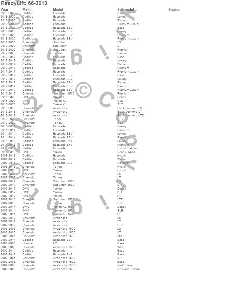 Below is an abbreviated list of applications for the Coil Spring Spacer.Avalanche, Avalanche 1500, Escalade, Escalade ESV, Escalade EXT, H2, Suburban, Suburban 1500, Tahoe, Yukon, Yukon XL, Yukon XL 1500, Cadillac, Chevrolet, GMC, Hummer, 2020, 2019, 2018, 2017