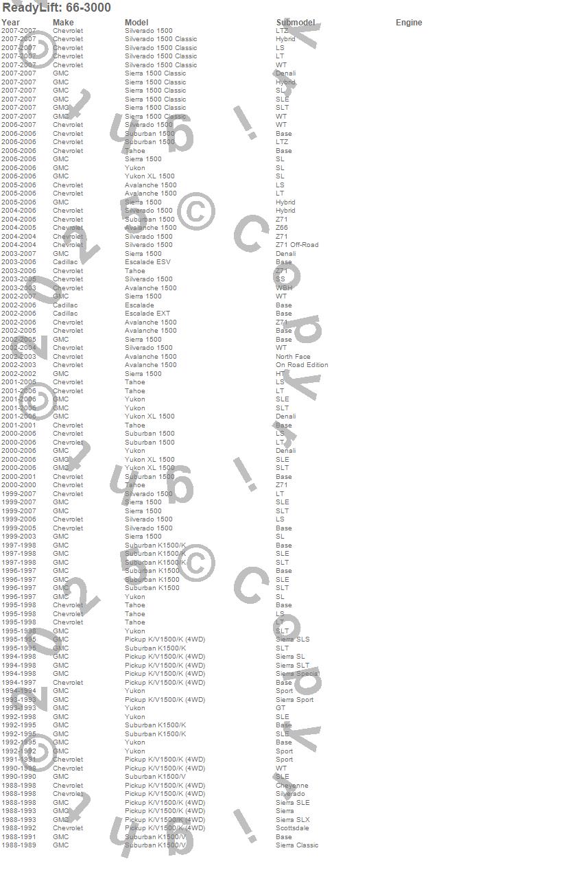 Below is an abbreviated list of applications for the Front Leveling Kit.Avalanche 1500, Escalade, Escalade ESV, Escalade EXT, K1500, K1500 Pickup, K1500 Suburban, Sierra 1500, Sierra 1500 Classic, Silverado 1500, Silverado 1500 Classic, Suburban 1500, Tahoe, V1500 Suburban, Yukon, Yukon XL 1500, Cadillac, Chevrolet, GMC, 2007