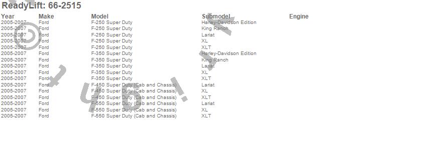Below is an abbreviated list of applications for the Front Leveling Kit.F-250 Super Duty, F-350 Super Duty, F-450 Super Duty, F-550 Super Duty, Ford, 2007, 2006, 2005