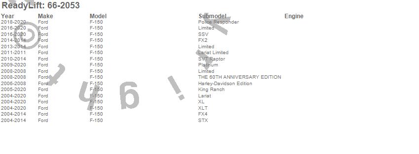 Below is an abbreviated list of applications for the Rear Block Kit.F-150, Ford, 2020, 2019, 2018, 2017, 2016, 2015, 2014, 2013, 2012, 2011, 2010, 2009, 2008, 2007, 2006, 2005, 2004