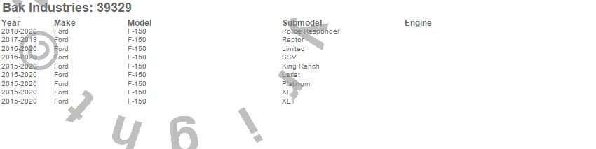 Brand: BAK IndustriesPart Number: 39329Tonneau Cover Type: Black - Vinyl Top w/ Aluminum Underside - Leather Grain FinishUPC: 819275022927