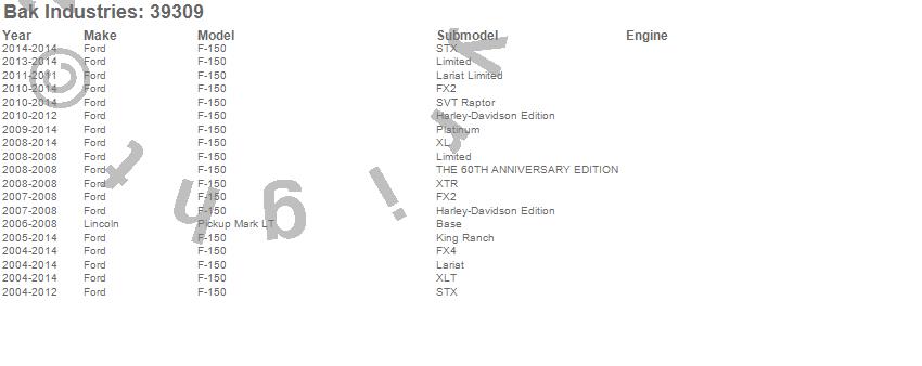 Brand: BAK IndustriesPart Number: 39309Tonneau Cover Type: Black - Vinyl Top w/ Aluminum Underside - Leather Grain FinishUPC: 819275022835