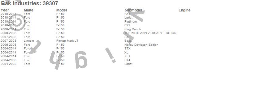 Brand: BAK IndustriesPart Number: 39307Tonneau Cover Type: Black - Vinyl Top w/ Aluminum Underside - Leather Grain FinishUPC: 819275022804