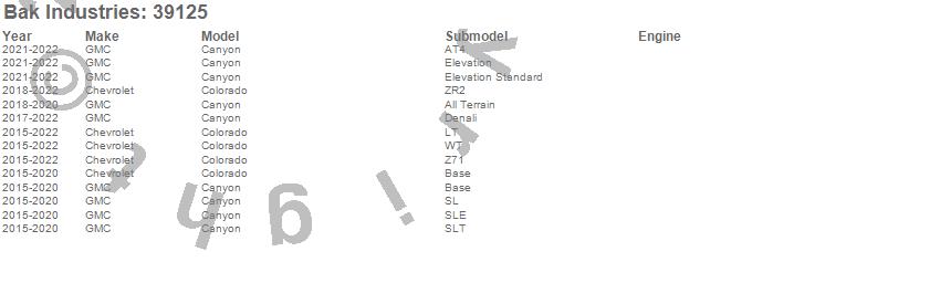 Brand: BAK IndustriesPart Number: 39125Tonneau Cover Type: Black - Vinyl Top w/ Aluminum Underside - Leather Grain FinishUPC: 819275022569