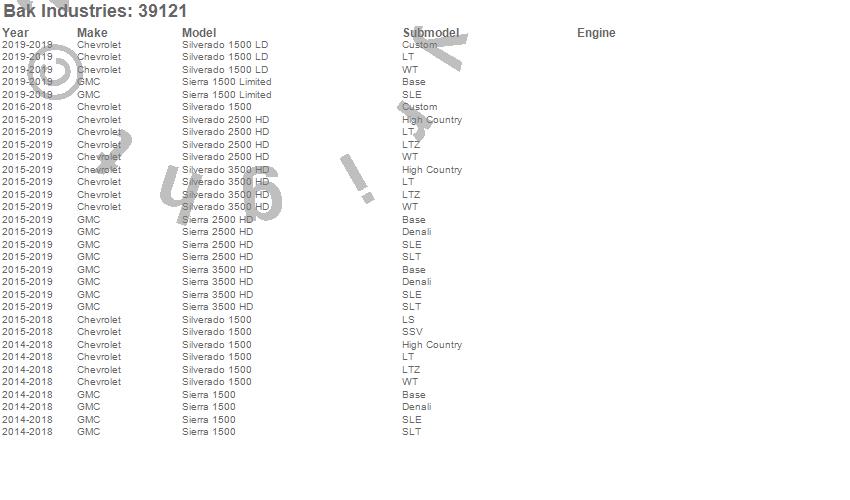 Brand: BAK IndustriesPart Number: 39121Tonneau Cover Type: Black - Vinyl Top w/ Aluminum Underside - Leather Grain FinishUPC: 819275022538