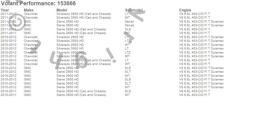 Below is an abbreviated list of applications for the Cold Air Intake Kit.Sierra 2500 HD, Sierra 3500 HD, Silverado 2500 HD, Silverado 3500, Silverado 3500 HD, Chevrolet, GMC, 2012, 2011, 2010