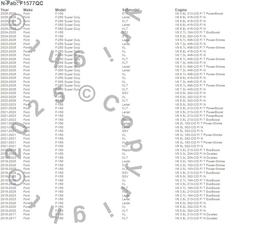 Below is an abbreviated list of applications for the Cab Length Nerf Step Bar.F-150, F-250 Super Duty, F-350 Super Duty, Ford, 2026, 2025, 2024, 2023, 2022, 2021, 2020, 2019, 2018, 2017, 2016, 2015