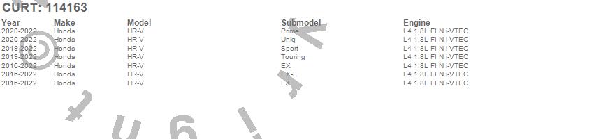 Below is an abbreviated list of applications for the Class I 1.25 in. Receiver Hitch.HR-V, Honda, 2022, 2021, 2020, 2019, 2018, 2017, 2016
