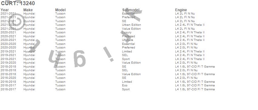 Below is an abbreviated list of applications for the Class III 2 in. Receiver Hitch.Tucson, Hyundai, 2021, 2020, 2019, 2018, 2017, 2016