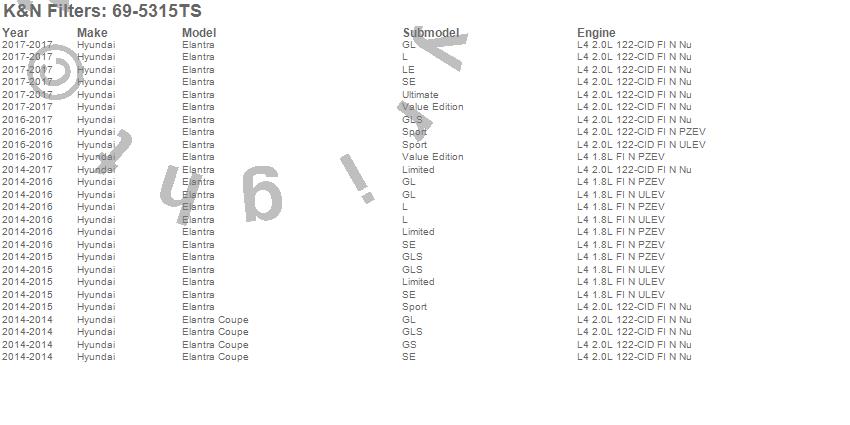 Below is an abbreviated list of applications for the Typhoon Cold Air Induction Kit.Elantra, Elantra Coupe, Hyundai, 2017, 2016, 2015, 2014
