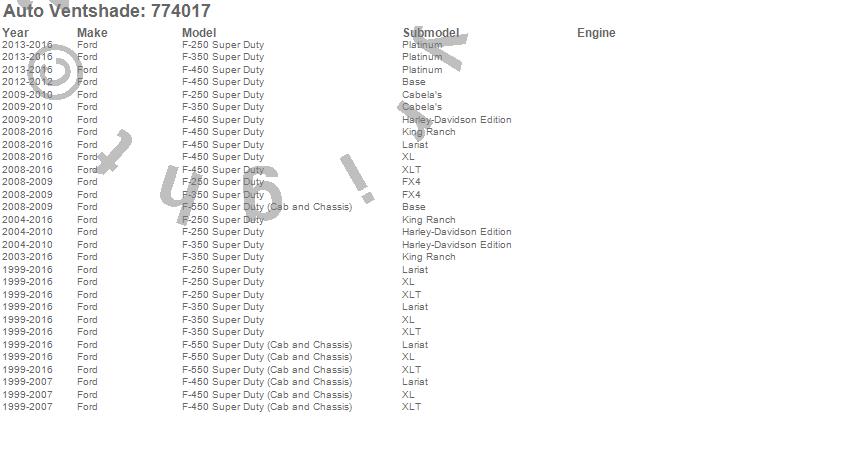 Below is an abbreviated list of applications for the Ventvisor Low Profile Deflector 4 pc..F-250 Super Duty, F-350 Super Duty, F-450 Super Duty, F-550 Super Duty, Ford, 2016, 2015, 2014, 2013, 2012, 2011, 2010, 2009, 2008, 2007, 2006, 2005, 2004, 2003, 2002