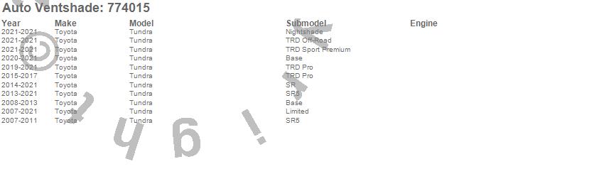 Below is an abbreviated list of applications for the Ventvisor Low Profile Deflector 4 pc..Tundra, Toyota, 2021, 2020, 2019, 2018, 2017, 2016, 2015, 2014, 2013, 2012, 2011, 2010, 2009, 2008, 2007