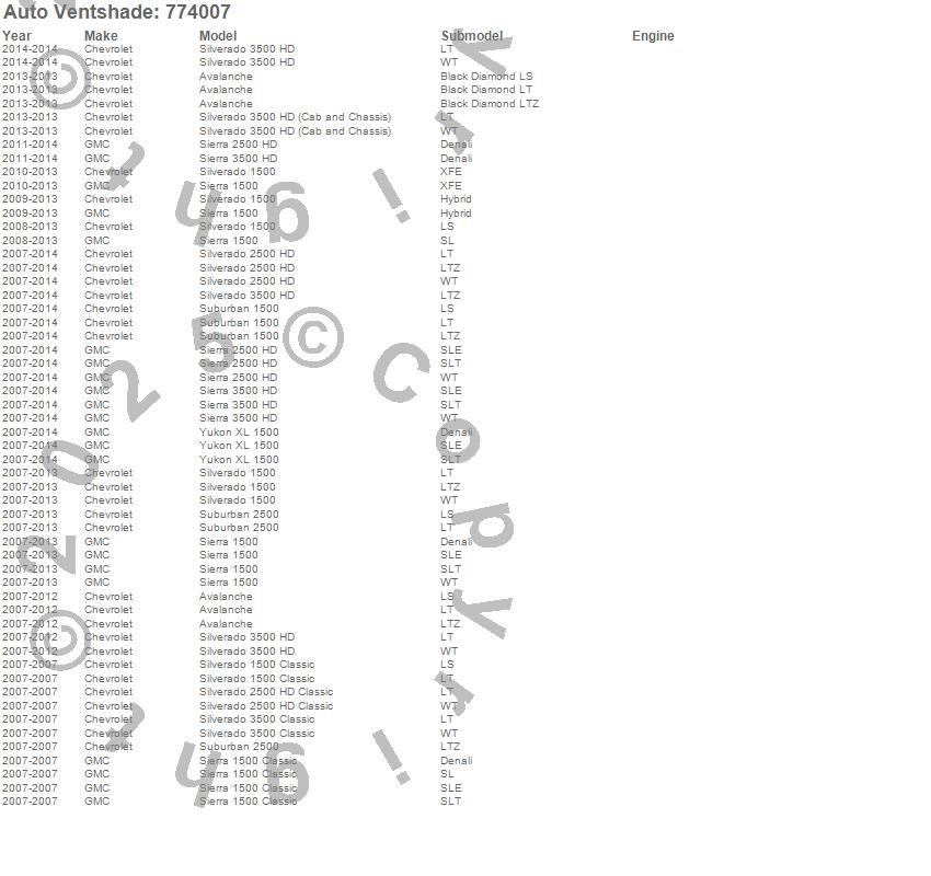 Below is an abbreviated list of applications for the Ventvisor Low Profile Deflector 4 pc..Avalanche, Sierra 1500, Sierra 1500 Classic, Sierra 2500 HD, Sierra 3500 HD, Silverado 1500, Silverado 1500 Classic, Silverado 2500 HD, Silverado 2500 HD Classic, Silverado 3500 Classic, Silverado 3500 HD, Suburban 1500, Suburban 2500, Yukon XL 1500, Chevrolet, GMC, 2014, 2013, 2012, 2011