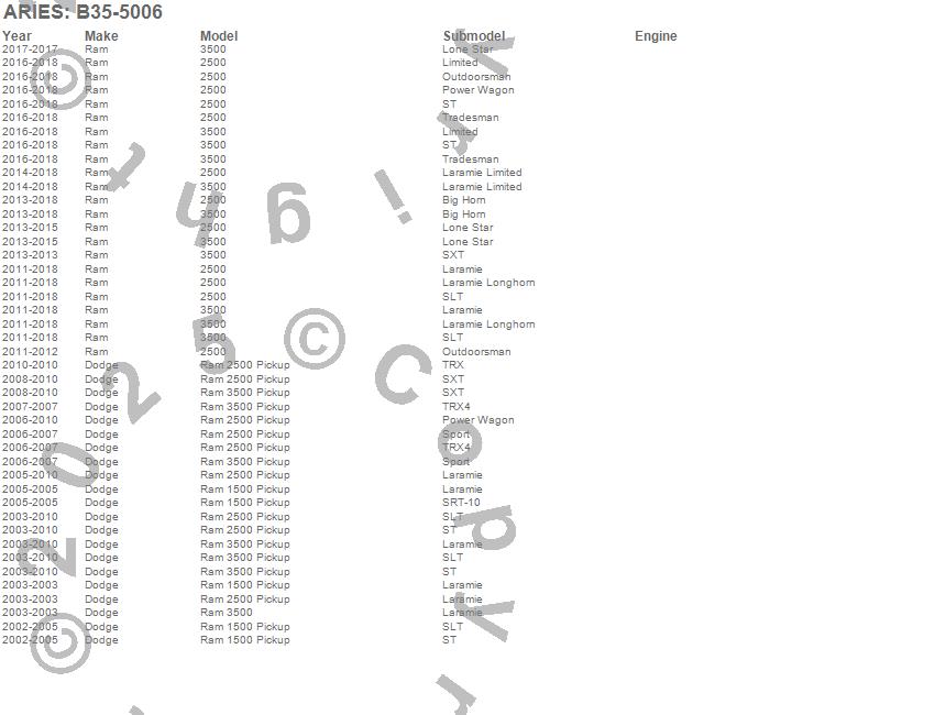 Below is an abbreviated list of applications for the Bull Bar.2500, 3500, Ram 1500, Ram 2500, Ram 3500, Dodge, Ram, 2018, 2017, 2016, 2015, 2014, 2013, 2012, 2011, 2010, 2009, 2008, 2007, 2006