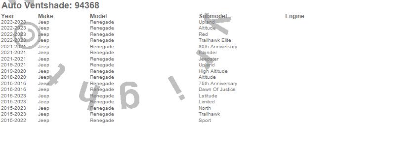 Below is an abbreviated list of applications for the Ventvisor Deflector 4 pc..Renegade, Jeep, 2023, 2022, 2021, 2020, 2019, 2018, 2017, 2016, 2015