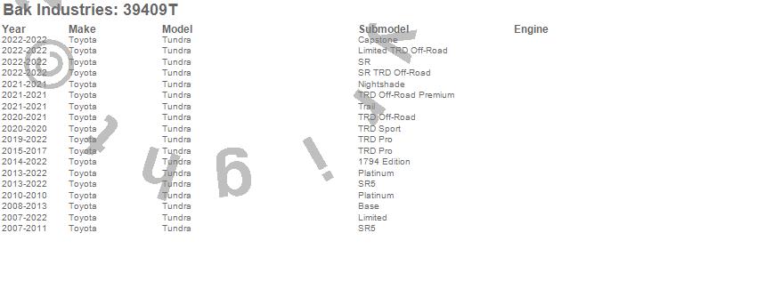 Brand: BAK IndustriesPart Number: 39409TTonneau Cover Type: Black - Vinyl Top w/ Aluminum Underside - Leather Grain FinishUPC: 819275023214
