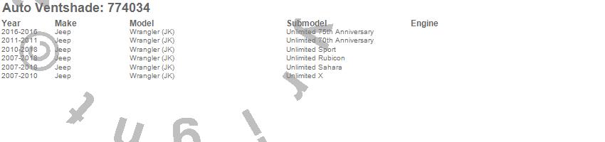 Below is an abbreviated list of applications for the Ventvisor Low Profile Deflector 4 pc..Wrangler (JK), Jeep, 2018, 2017, 2016, 2015, 2014, 2013, 2012, 2011, 2010, 2009, 2008, 2007