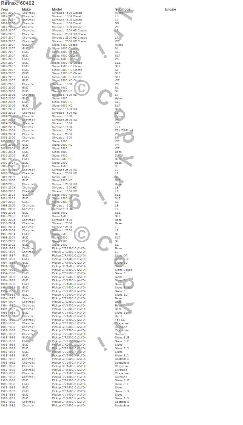 Below is an abbreviated list of applications for the RetraxONE MX Retractable Tonneau Cover.C1500 Pickup, C2500 Pickup, K1500, K1500 Pickup, K2500 Pickup, Sierra 1500, Sierra 1500 Classic, Sierra 1500 HD, Sierra 1500 HD Classic, Sierra 2500, Sierra 2500 HD, Sierra 2500 HD Classic, Silverado 1500, Silverado 1500 Classic, Silverado 1500 HD, Silverado 1500 HD Classic, Silverado 2500, Silverado 2500 HD, Silverado 2500 HD Classic, Chevrolet