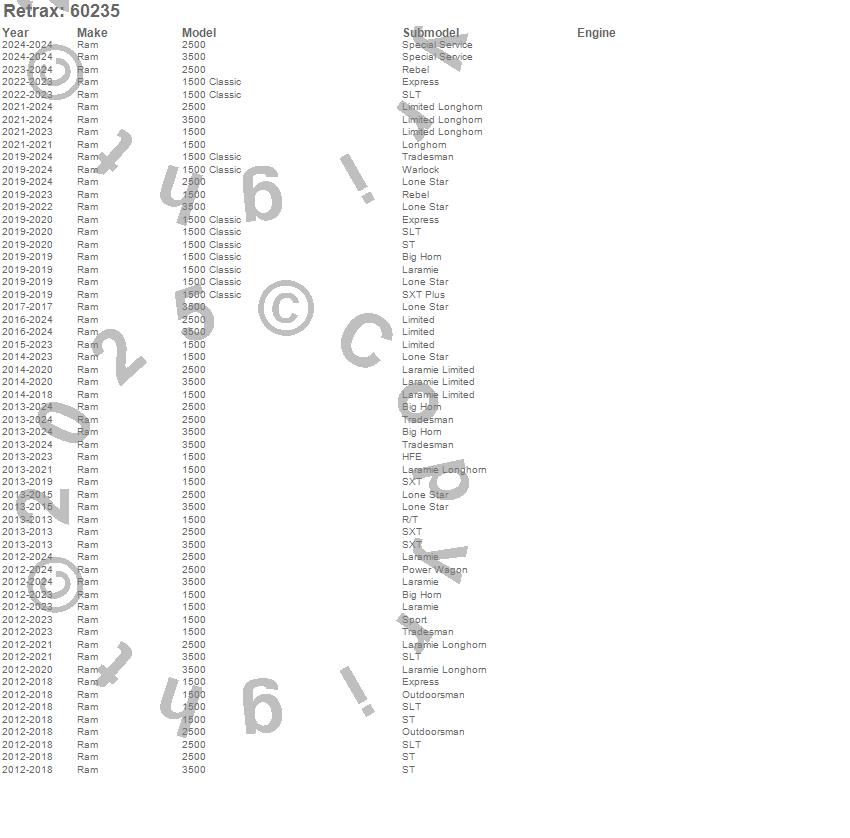 Brand: RetraxPart Number: 60235Tonneau Cover Type: Matte One Piece Polycarbonate Finish - w/RamBox Cargo Management SystemUPC: 840563113980