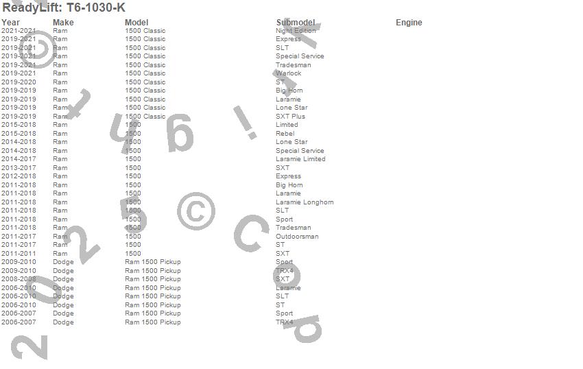 Below is an abbreviated list of applications for the T6 Billet Front Leveling Kit.1500, 1500 Classic, Ram 1500, Dodge, Ram, 2021, 2020, 2019, 2018, 2017, 2016, 2015, 2014, 2013, 2012, 2011, 2010, 2009, 2008, 2007