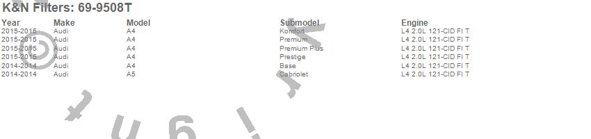 Brand: K&N FiltersPart Number: 69-9508TAir Intake Kit Type: Incl. Air Filter/Heat Shield/Tubing/Hardware - Estimated Horsepower Gain 15.49 HP At 3600 RPMUPC: 024844361868