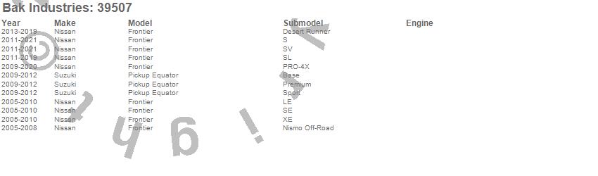 Brand: BAK IndustriesPart Number: 39507Tonneau Cover Type: Black - Vinyl Top w/ Aluminum Underside - Leather Grain FinishUPC: 819275023122
