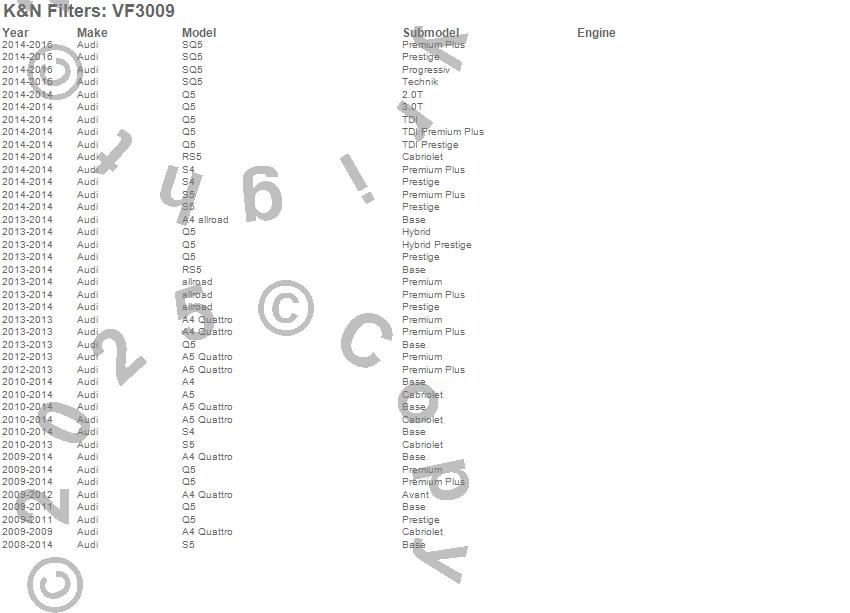 Below is an abbreviated list of applications for the Cabin Air Filter.A4, A4 allroad, A4 Quattro, A5, A5 Quattro, allroad, Q5, RS5, S4, S5, SQ5, Audi, 2016, 2015, 2014, 2013, 2012, 2011, 2010, 2009