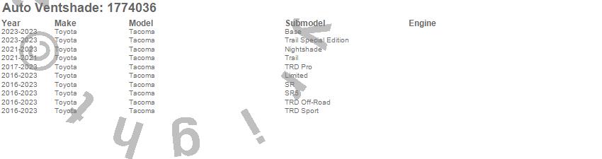 Below is an abbreviated list of applications for the Ventvisor Low Profile Deflector 4 pc..Tacoma, Toyota, 2023, 2022, 2021, 2020, 2019, 2018, 2017, 2016