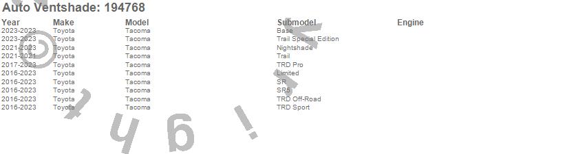 Below is an abbreviated list of applications for the Ventvisor In-Channel Deflector 4 pc..Tacoma, Toyota, 2023, 2022, 2021, 2020, 2019, 2018, 2017, 2016