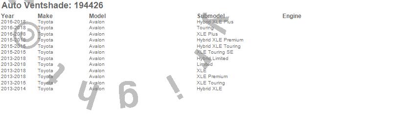 Below is an abbreviated list of applications for the Ventvisor In-Channel Deflector 4 pc..Avalon, Toyota, 2018, 2017, 2016, 2015, 2014, 2013