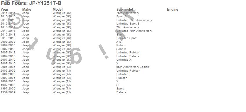 Brand: Fab FoursPart Number: JP-Y1251T-BSpare Tire Carrier Type: Uncoated/Paintable - For Use w/PN[JP97-Y1051/JK07-Y1251] - [AWSL]UPC: 005810101671