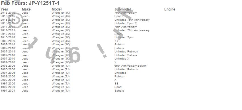 Brand: Fab FoursPart Number: JP-Y1251T-1Spare Tire Carrier Type: 2 Stage Black Powder Coated - For Use w/PN[JP97-Y1051/JK07-Y1251]UPC: 005810101664