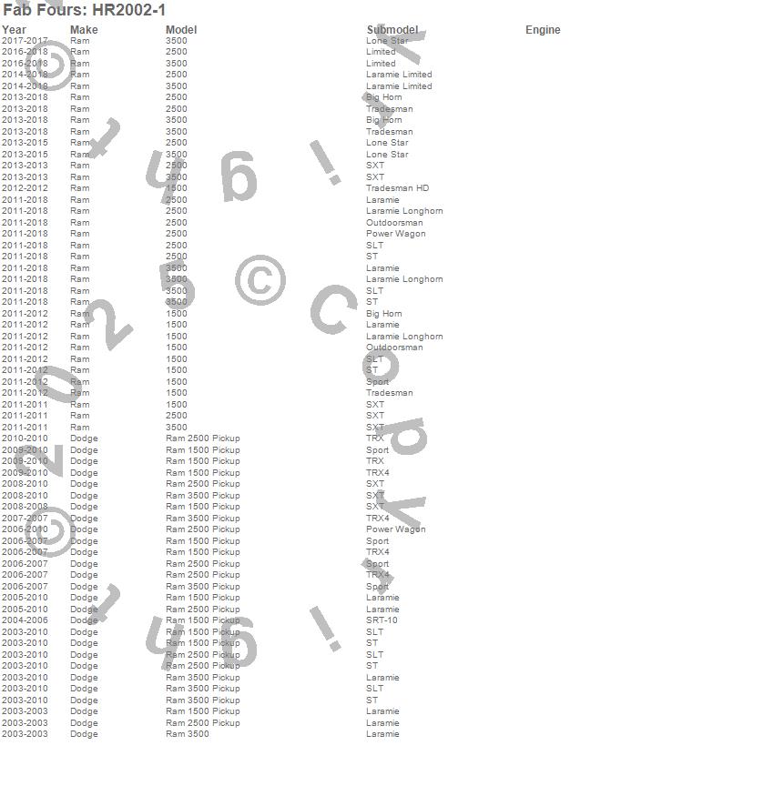 Brand: Fab FoursPart Number: HR2002-1Truck Cab Protector/Headache Rack Type: 2 Stage Black Powder CoatedUPC: 005810106362