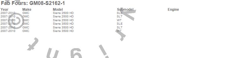 Brand: Fab FoursPart Number: GM08-S2162-1Bumper- Front Type: 2 Stage Black Powder Coated - w/Pre-Runner Grill Guard - Incl. Light Cut-OutsUPC: 005810102272