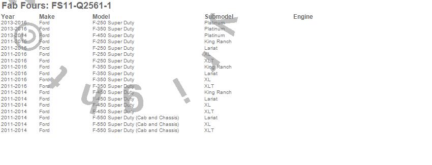 Below is an abbreviated list of applications for the Elite Front Bumper.F-250 Super Duty, F-350 Super Duty, F-450 Super Duty, F-550 Super Duty, Ford, 2016, 2015, 2014, 2013, 2012, 2011