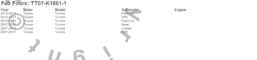 Brand: Fab FoursPart Number: TT07-K1861-1Bumper- Front Type: 2 Stage Black Powder Coated - w/o Grill Guard - Incl. Light Cut-OutsUPC: 005810105013