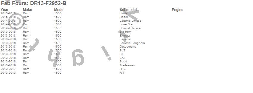 Brand: Fab FoursPart Number: DR13-F2952-BBumper- Front Type: Uncoated/Paintable - w/Pre-Runner Grill Guard - w/Sensors - [AWSL]UPC: 005810109134