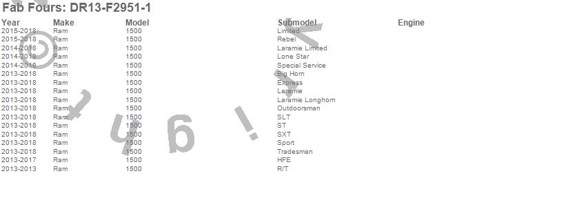 Brand: Fab FoursPart Number: DR13-F2951-1Bumper- Front Type: 2 Stage Black Powder Coated - w/o Grill Guard - w/SensorsUPC: 005810109103